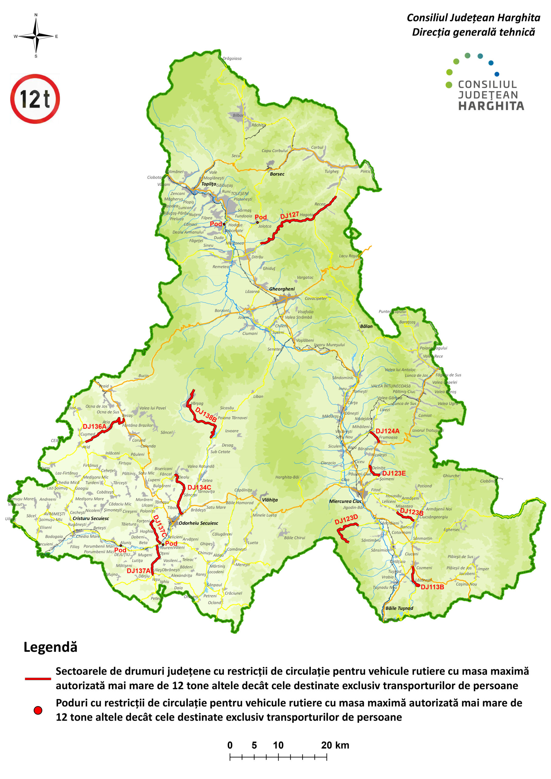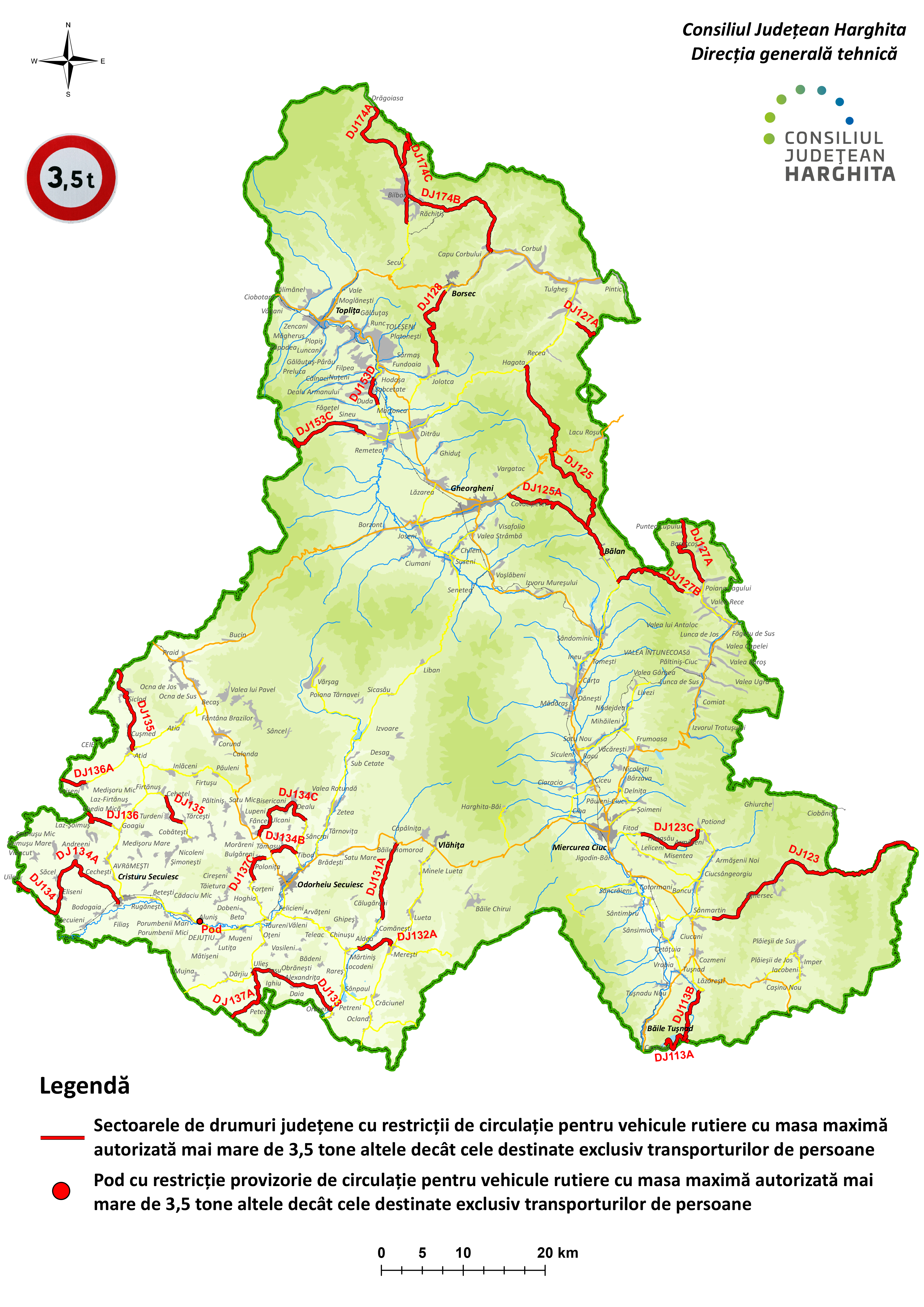 În prezent, sunt instituite limite de greutate de 12 și 3,5 tone pe tronsoanele de drum județean prezentate pe harta de mai jos. Vehiculele care depășesc greutatea limită sunt obligate să solicite o autorizație specială de transport de la Consiliul Județean Harghita dacă doresc să tranziteze aceste drumuri.