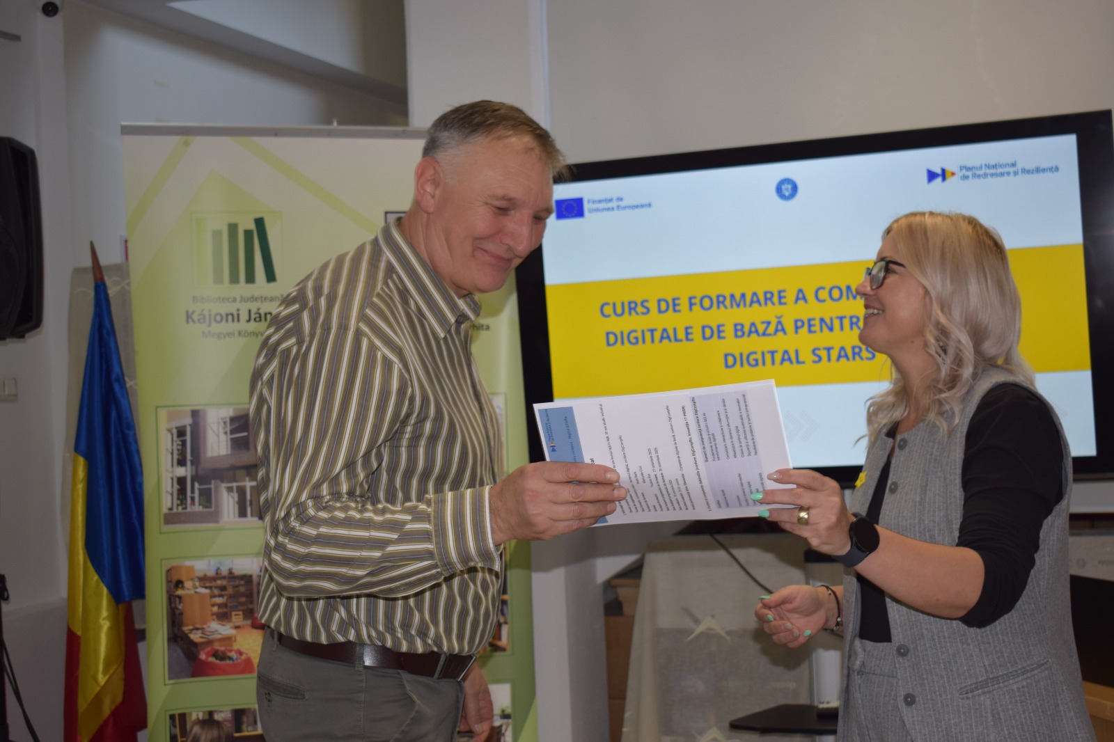Prima sesiune de formare, desfășurată în perioada 27–31 octombrie 2025 la Biblioteca Județeană „Kájoni János” din Miercurea Ciuc, a reunit bibliotecari din județul Harghita care vor deveni formatori în competențe digitale de bază. Participanții au parcurs un program intensiv de pregătire, axat pe alfabetizare digitală, design instrucțional, utilizarea platformelor de învățare, adaptarea instruirilor la nevoile comunităților locale și planificarea activităților viitoare. La final, toți cei prezenți au promovat cursul și au primit diplomele aferente.